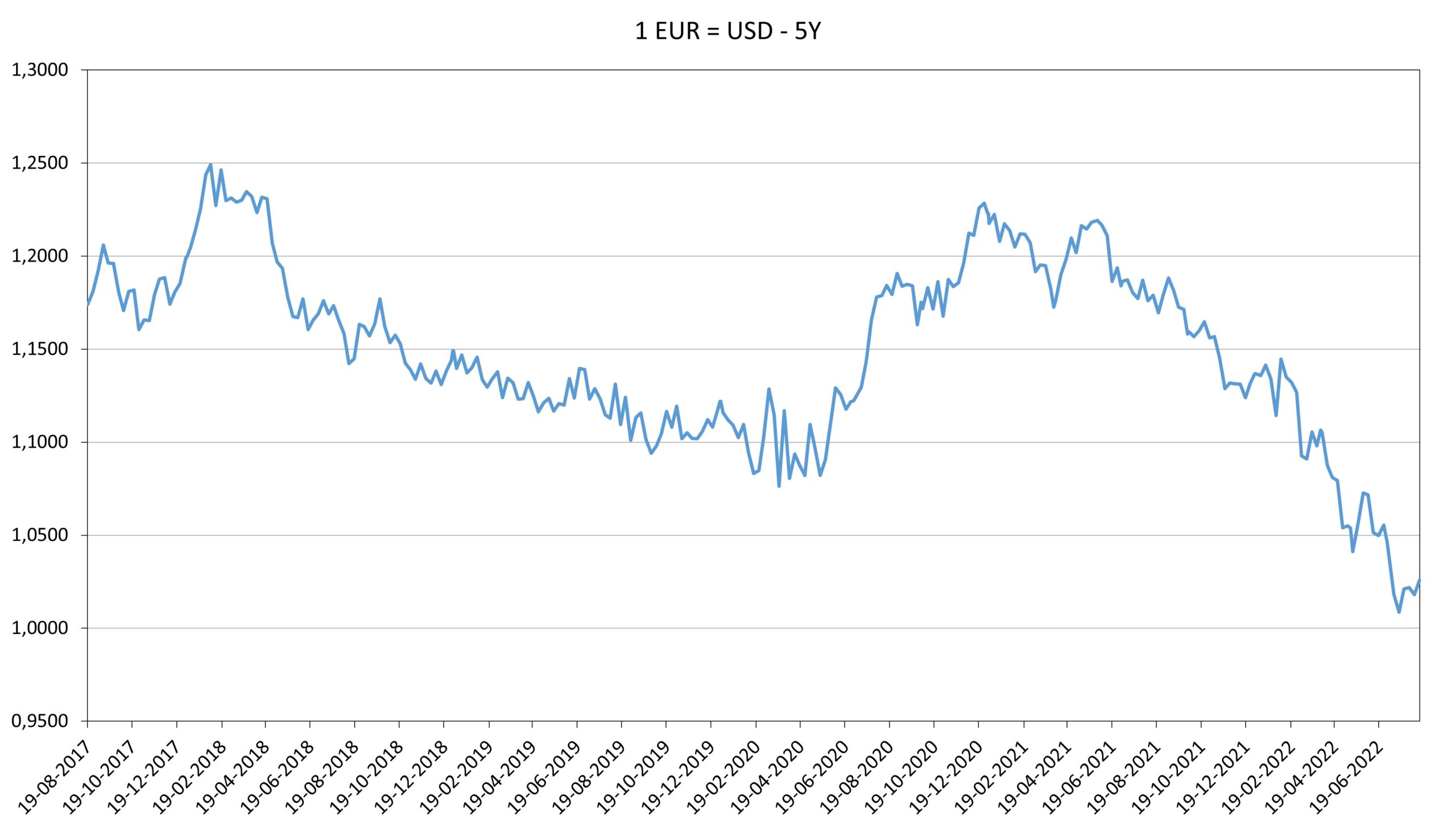 Een van de redenen van het sterke herstel van mijn portefeuille is simpel. De sterkere dollar. Het afgelopen jaar is de dollar in heel hoog tempo sterker geworden ten opzichte van de Euro. Je krijgt steeds minder Amerikaanse Dollars voor 1 Euro. Op sommige momenten zelfs maar 1 Dollar of nog iets minder (mijn grafiek laat alleen de koersen aan het einde van de week zien). Mijn ETFs zijn genoteerd in Euro’s. Maar veel van de aandelen die onderdeel zijn van deze ETFs zijn genoteerd in Dollars. Valuta-effecten dus.