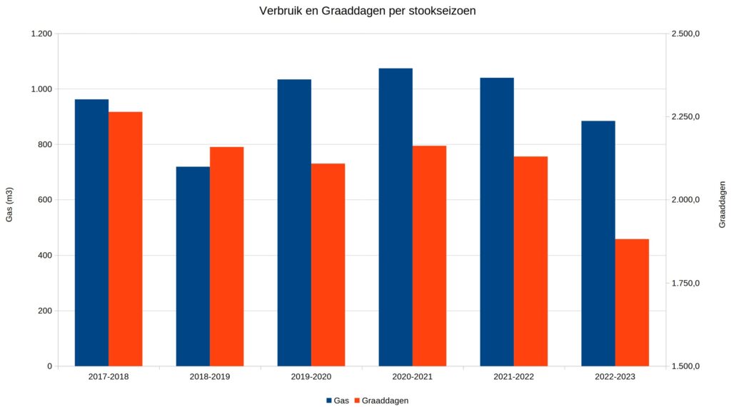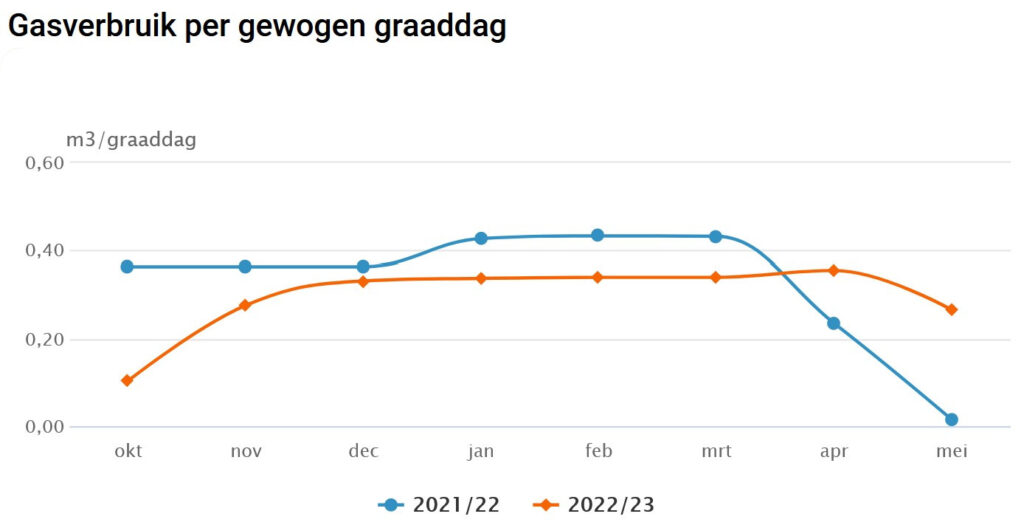 Ons gasverbuik per gewogen graaddag ligt in het zojuist afgesloten stookseizoen behoorlijk lager dan in het vorige stookseizoen. Pas aan het eind van het seizoen slaat dat om. Dat is niet gek, vorig jaar sloten we op 12 april af en dit jaar pas op 3 mei.