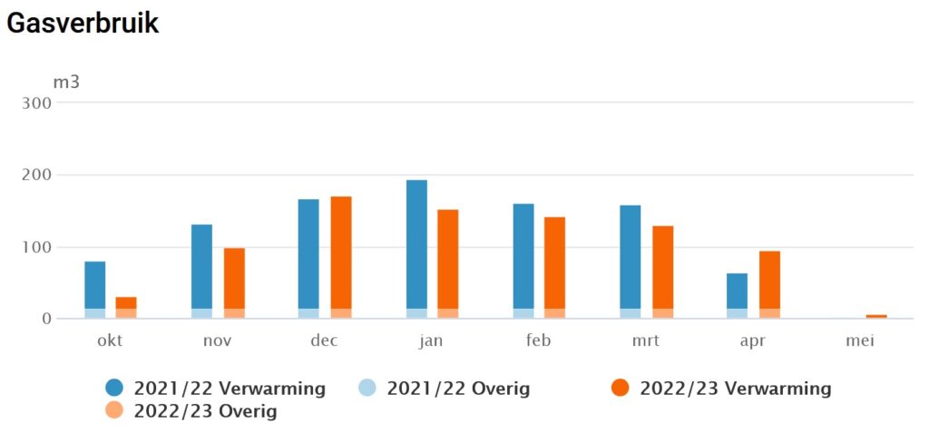 Gelukkig heb ik vorig jaar wel met terugwerkende kracht onze verbruiksgegevens ingevoerd bij MinderGas. En daar kan ik eenvoudig periodevergelijkingen maken tussen het stookseizoen 2022 – 2023 en het voorgaande stookseizoen 2021 – 2022. Dat geeft mij al het nodige inzicht.