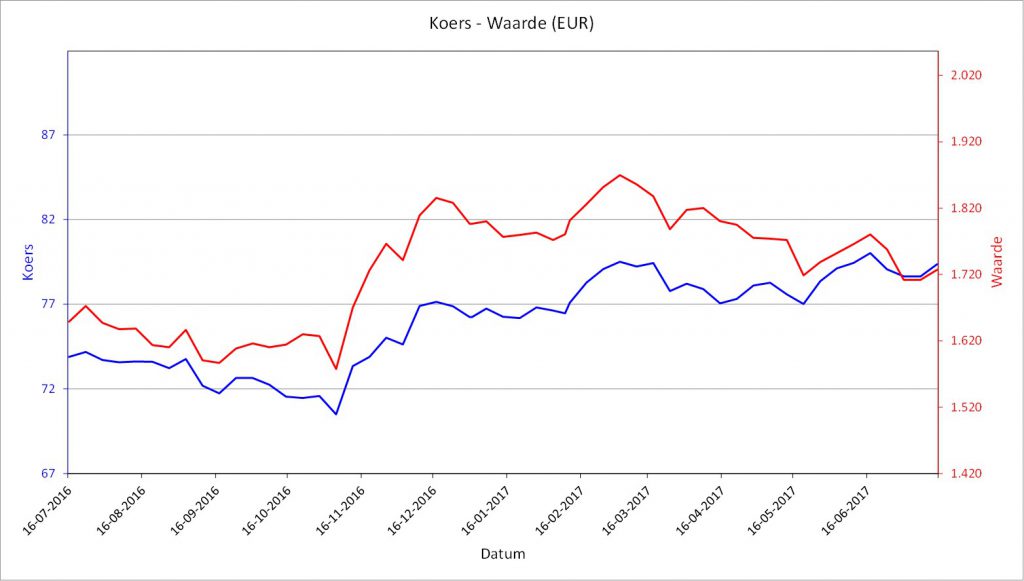 Een voorbeeldje zie je in onderstaande grafiek, van een kleine positie in één van de fondsen in mijn portefeuille die in Amerikaanse dollars genoteerd is. De blauwe lijn, de koers in Amerikaanse dollars, vertoont vanaf november 2016 een stijgende trend. Maar de rode lijn, de waarde van mijn positie in Euro’s, is juist gedaald! Dat is het effect van de wisselkoers.