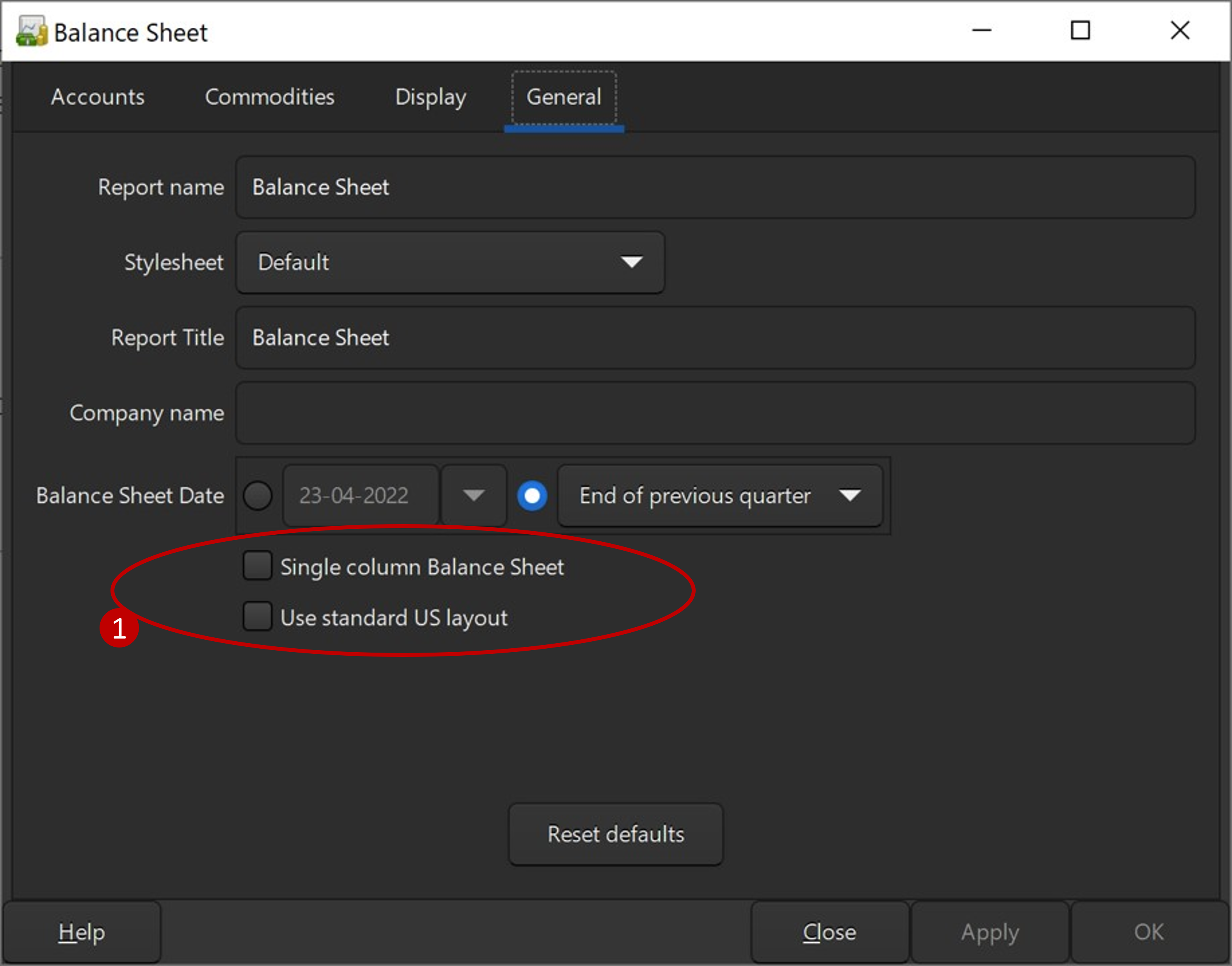 De balans vind je via ‘Reports | Assets & Liabilities | Balance Sheet’. In onderstaand screenshot zie je de instellingen die ik hiervoor gebruik. Het belangrijkste is dat ik op het tabblad ‘General’ de opties ‘Use standard US layout’ en ‘Single column Balance Sheet’ heb uitgeschakeld (1).