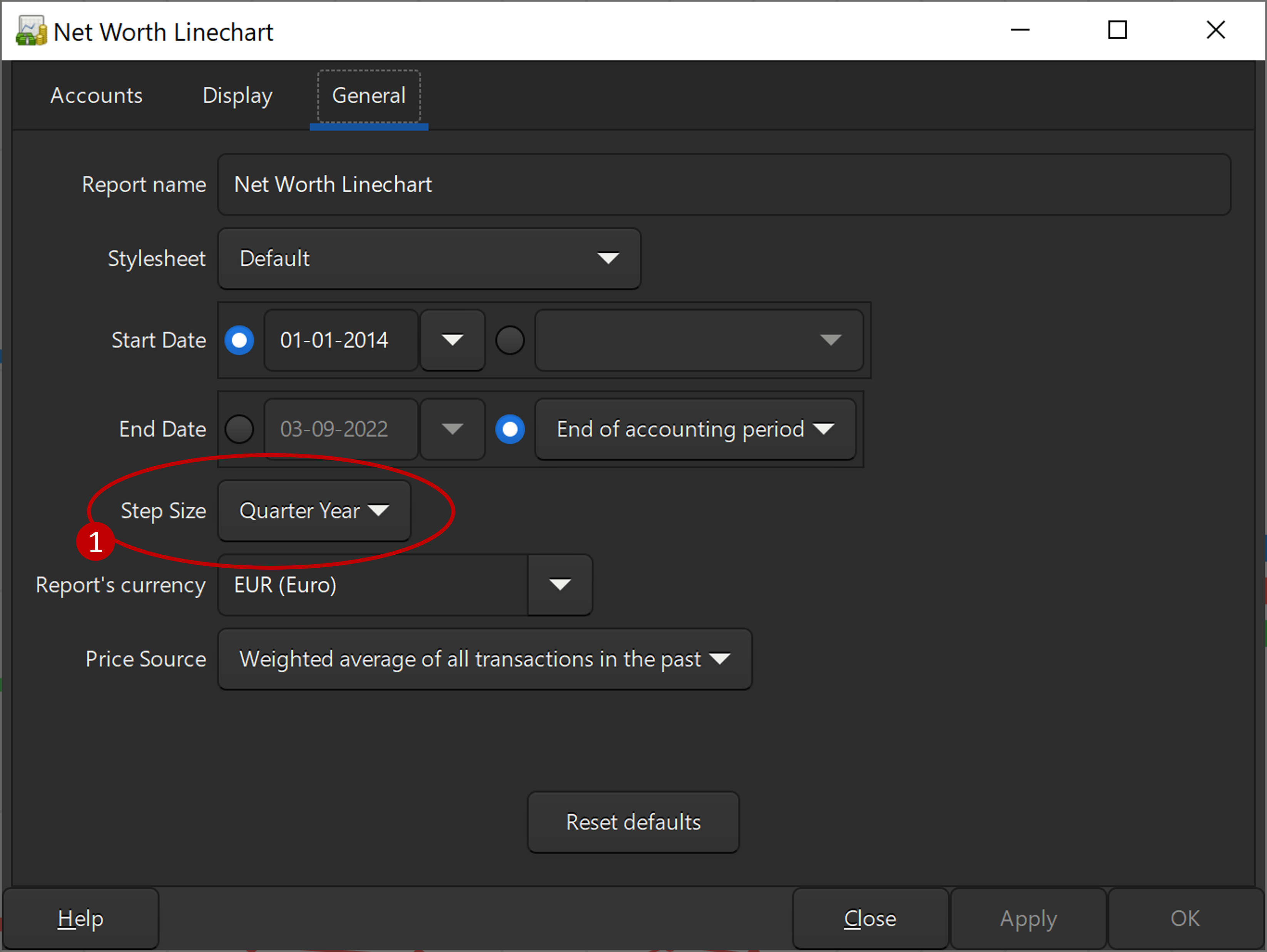Deze rapportage, te vinden via ‘Reports | Assets & Liabilities | Net Worth Line Chart’ zet de ontwikkeling van je Net Worth (eigen vermogen), bezittingen en verplichtingen uit in de tijd. Je kunt zelf het startmoment en de einddatum instellen uiteraard. Belangrijkste instelling voor mij is hier de instelling per kwartaal (1). Die periode hanteerde ik in mijn oude Capital Dashboard ook. Je kunt uiteraard ook een andere periode kiezen, zelfs per dag is mogelijk.