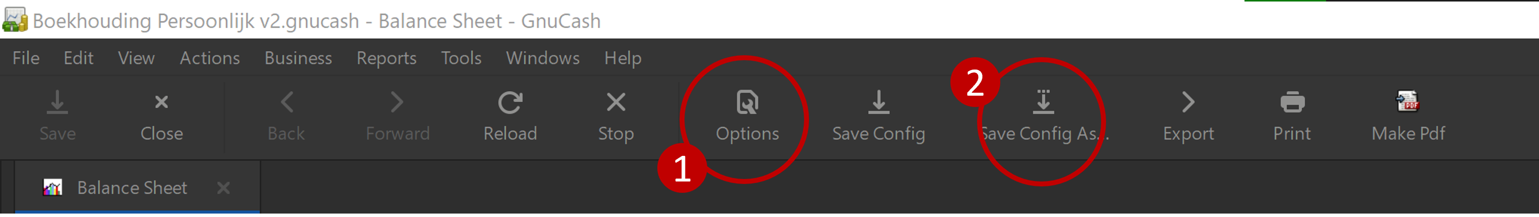 Binnen GnuCash kun je veel dingen instellen in de rapportages. Als je via ‘Reports’ één van de rapportages gekozen hebt en het rapport op je scherm staat, heb je hier in de werkbalk de nodige opties voor. Via de knop ‘Options’ (1) kom je in het instellingenscherm voor de betreffende rapportage. En als je de instellingen aangepast hebt kun je die opslaan met ‘Save Config’ of ‘Save Config As’ (2). Ik gebruik zelf altijd die tweede optie, want dan blijft het originele rapport ook behouden. De door jezelf opgeslagen configuraties kun je terugvinden via ‘Reports | Saved Report Configurations’.