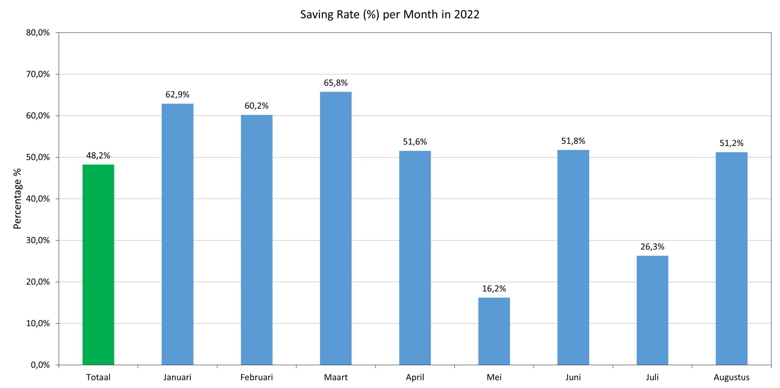 Je kunt met GnuCash ook maatwerkrapporten bouwen. Daar heb ik me nog niet in verdiept, en (behalve deze wiki-pagina) ook nog geen goede voorbeelden of beschrijving van gevonden. Daar ga ik me dit najaar nog wel verder in verdiepen. Zo wil ik in elk geval een rapportage bouwen om mijn Spaarpercentage in de gaten te houden. Naar het voorbeeld van onderstaande grafiek uit mijn administratie, die ik ook vaak gebruik op mijn blog. Want het spaarpercentage is een belangrijk getal dat ik echt wel wil kunnen volgen. En ik ga ook nog kijken naar aanvullende rapportages rond mijn beleggingsportefeuille.