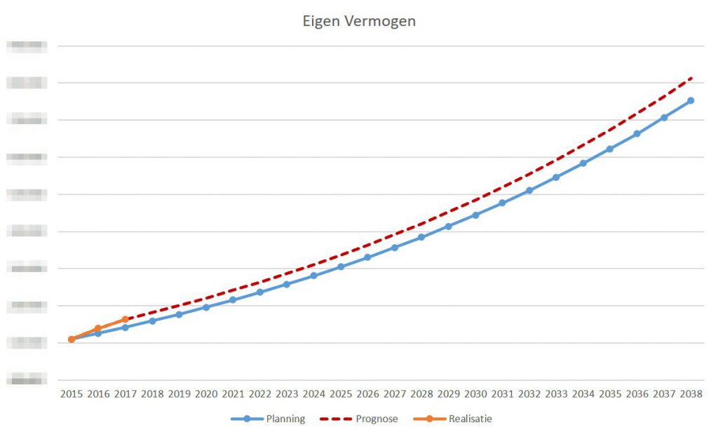 Ik ben blij dat de ontwikkeling van mijn eigen vermogen voor ligt op die doelstellingen. Ik sta nu op het punt dat ik medio 2018 hoopte te bereiken. En dat ondanks een echtscheiding en de impact van een verblijf in het buitenland waarbij ik (1) minder verdiende en (2) mijn eigen pensioenopbouw betaald heb. De huidige stand betekent namelijk dat mijn doelstelling voor financiële onafhankelijkheid nog steeds binnen bereik is.